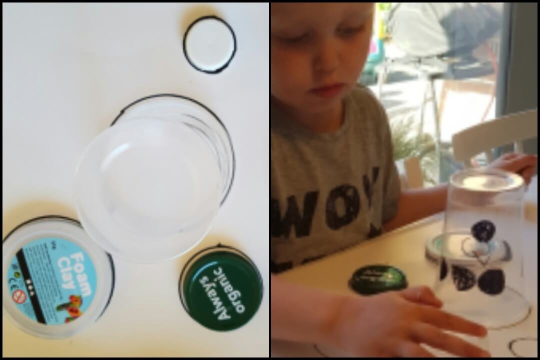 Tegn udenom de forskellige lรฅg og lรฆg dem ved siden af papiret. Lad nu dit barn finde ud af hvilket lรฅg, der passer til hvilken cirkel?