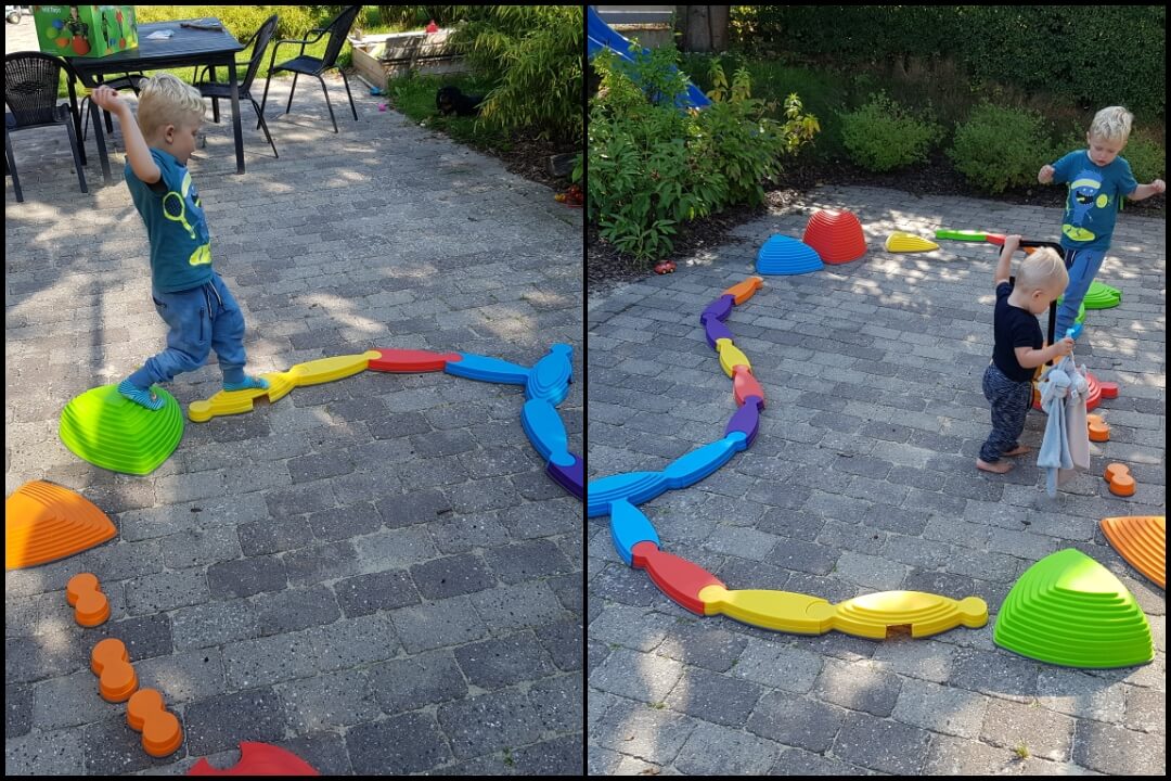 De to produkter, som jeg har testet bestรฅr af flere elementer. Gonge Hillstones bestรฅr af 5 bakketoppe i forskellige hรธjder og farver. Gonge Landskab er en kรฆmpe pakke med hele 25 dele i forskellige stรธrrelser og alle i samme hรธjde. Alle Gonges produkter kan bruges sammen pรฅ kryds og tvรฆrs, sรฅ jeg lavede en fin motorikbane med fokus pรฅ balance i haven til Bjรธrn og Eskild. Banen lavede jeg i en storย cirkel, men den kan sagtens laves, sรฅ der er flere veje end kun en. Jeg stillede Gonge Hillstones, sรฅ hรธjdeforskellen mellem den hรธjeste “bakketop” og en af “landskabspladerne” ikke var for stor, da Bjรธrn ikke er super sikker motorisk. Desuden kan svรฆrhedsgraden let justeres ved at lave stรธrre eller mindre afstand mellem de forskellige produkter. Bรฅde Eskild pรฅ knap 2 รฅr og Bjรธrn pรฅ 4,5รฅr havde stor glรฆde af legene omkring produkterne. Bรฅde Gonge Hillstones og Landskab kan sagtens bruges til stรธrre bรธrn (og voksne ) – jeg synes i hvert fald det var sjovt at balancere med;-D
