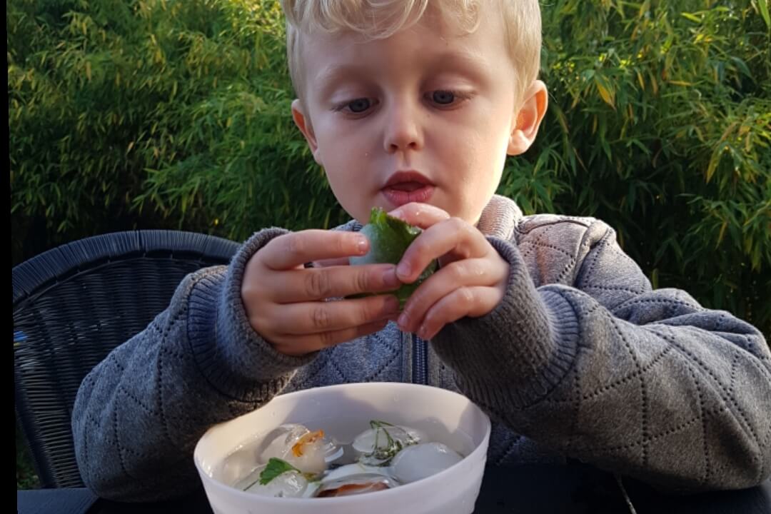 B på 5 år og jeg lavede dette iskolde forsøg med isklumper, hvor jeg havde frosset sten, blade, blomster, græs osv ind i.