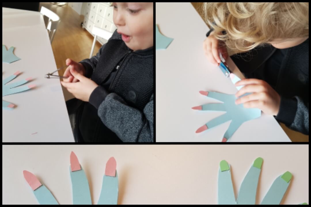Der er langt imellem, at B bliver Sร begejstret over en aktivitet – han er jo ret forvent efterhรฅnden! Men ligesom den anden aktivitet, hvor vi ogsรฅ tegnede efter hans hรฅnd, sรฅ tegnede og klippede vi hans fine hรฆnder ud igen her. Bagefter lavede vi en mandehรฅnd med korte negle og en damehรฅnd med flotte lange negle. B fik sรฅ negleklipperen og sad meget koncentreret og klippede negle pรฅ “hรฅnden”, kun afbudt af “ooorv” over hvor fedt det var!