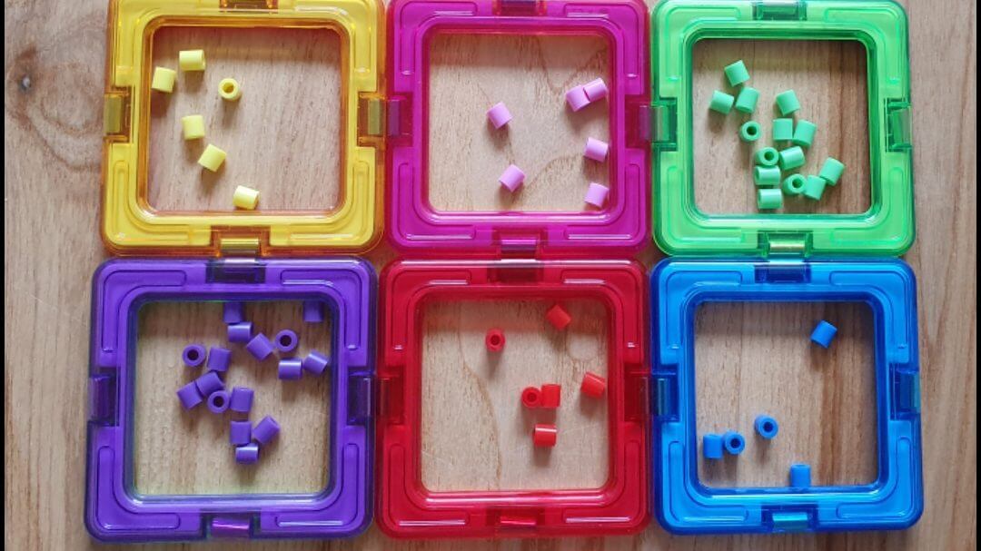 Brug dine magnatiles til at vise farverne, hvor dit barn skal placere smรฅ Hamas perler. Hvis svรฆrhedsgraden skal รธges sรฅ lad dit barn samle perlerne op med en tang eller ske.