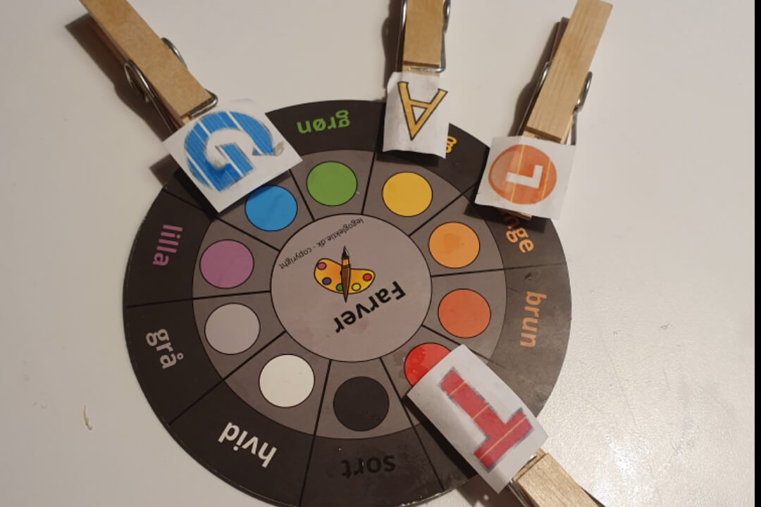 Jeg satte farvede bogstaver pรฅ klemmer, og Eskild skulle sรฅ fรธrst sรฆtte dem pรฅ den rigtige farve. Bagefter vendte vi cirklen, og han skulle finde de rigtige bogstaver!