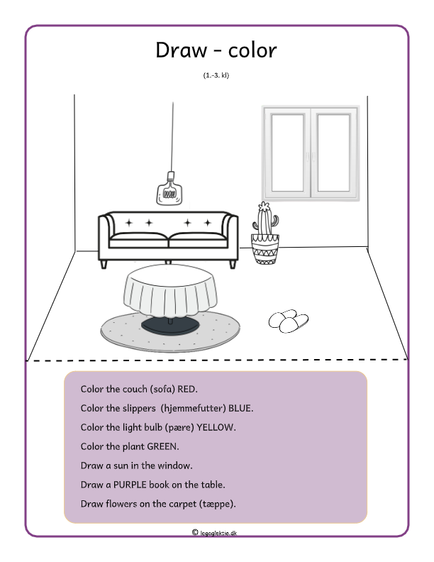 Ofte tiltænker man farvning og tegning til noget, der udelukkende hører til i 1.-3. kl, mest fordi børn stadig har behov for at udfolde sig kreativt med et minimalt fokus på læring. Der er intet forkert i at tegne eller farve helt indtil 3. klasse i engelsk, men det er forkert at tænke, at når opgaver indebærer tegning/farvning, at det ikke kan give et lærerigt udbytte. Udover at give et kreativt indspark kan tegneopgaver medvirke til at udvikle færdigheder og teste viden og forståelse af i engelsk.