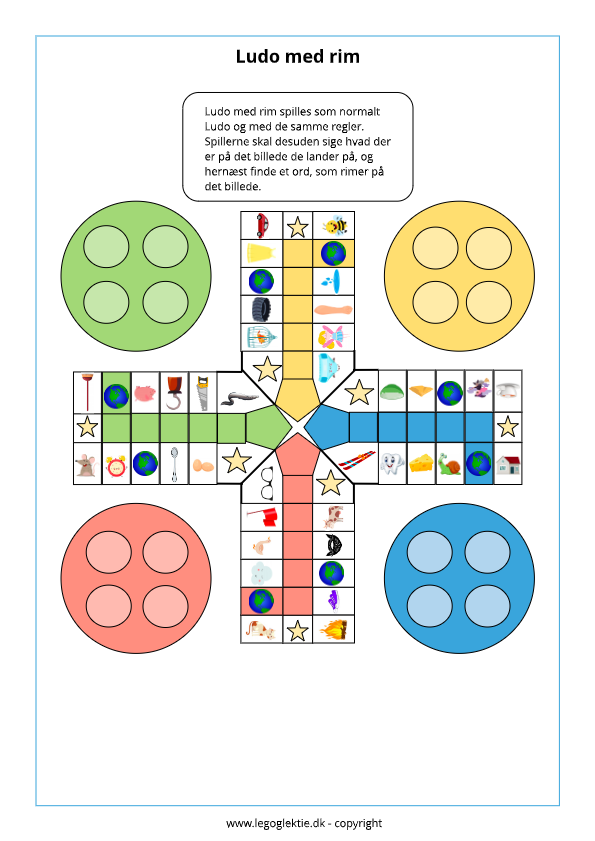 1. Rim – spil ludo som normalt, men nรฅr du lander pรฅ et billede skal dit barn finde et ord, der rimer pรฅ billedet.