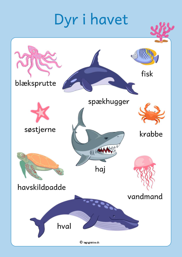 Her får du en super fin læringsplakat med dyr i havet. Plakaten kan med fordel printes, lamineres og hænges op. Den kan støtte dit barns sprogudvikling ved, at der er billeder, som dit barn har større mulighed for at genkende, og dermed koble ord dertil.