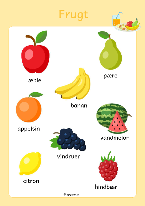Her fรฅr du en super fin lรฆringsplakat med forskellige frugter. Plakaten kan med fordel printes, lamineres og hรฆnges op. Den kan stรธtte dit barns sprogudvikling ved, at der er billeder, som dit barn har stรธrre mulighed for at genkende, og dermed koble ord dertil.