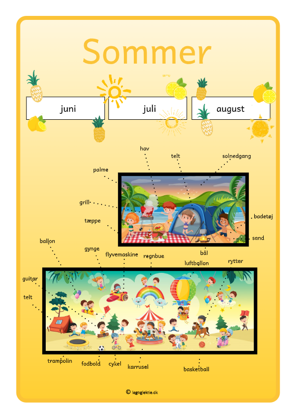 Pรฅ plakaten med sommer kan du sammen med dit barn snakke om, hvilke mรฅneder der er i denne รฅrstid. Derudover kan I ogsรฅ snakke ud fra de to billeder, der er pรฅ plakaten – det er nemlig mange af de ord, som bliver brugt i forbindelse med sommer. I kan ogsรฅ lave en sjov konkurrence, hvor I kan se, hvem der kan skrive flest sommer-ord ned pรฅ 1 minut. ‘