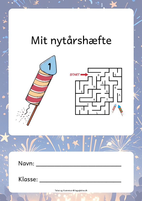 Hæftet har et dansk- og matematikfagligt fokus, hvor dit barn bl.a. skal finde vej gennem labyrinter, farvelægge, tegne fyrværkeri og tælle nytårsting.