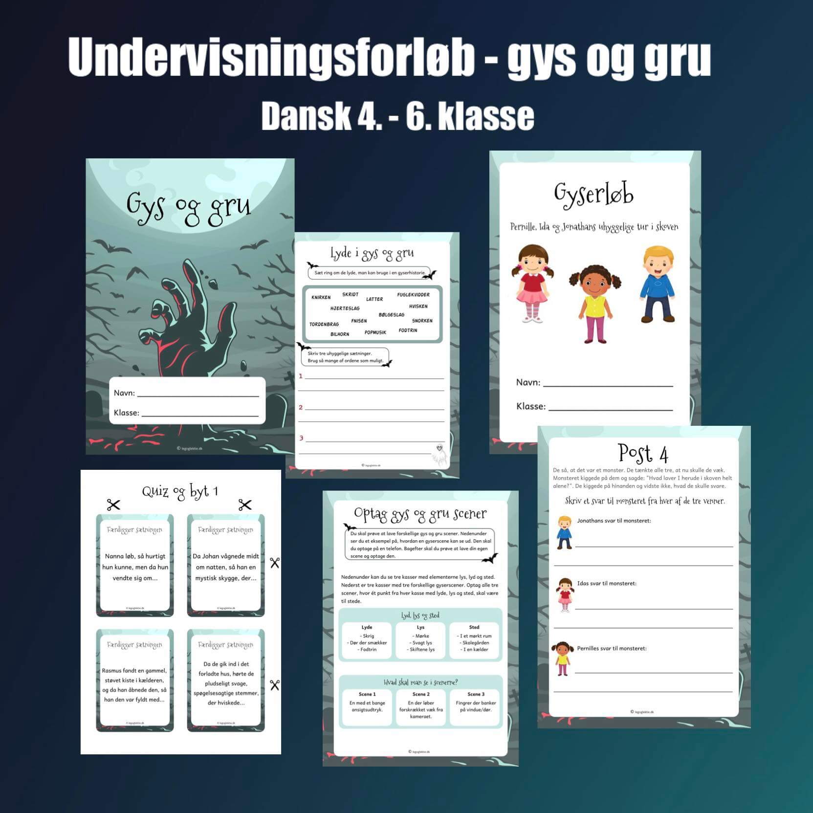 Forløbet handler om temaet gys og gru og genren gyser. Genren bliver foldet ud, og dit barn får mulighed for at lære, hvilke elementer den består af. Det indebærer hvilke ord, der knytter sig til emnet, hvordan man benytter sig af et beskrivende sprog, og hvilken stor betydning det har for genren. Derudover lærer dit barn også om opbygningen af en historie, og hvilke faser der typisk er i en gyserhistorie. Herunder læres der om berettermodellen. Til slut skal dit barn selv skrive sin egen gyserhistorie.