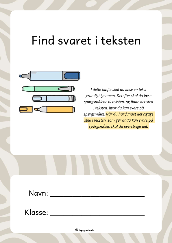 I dette hรฆfte kan du barn trรฆne, at lรฆse og forstรฅ en tekst og historie. รn ting er, at lรฆse en tekst eller en historie, en anden ting er, at forstรฅ det lรฆste. Det er netop dรฉt, som dit barn kan trรฆne i dette hรฆfte. Hรฆftet indeholder forskellige typer opgaver. รn af opgavetyperne er, at dit barn skal lรฆse en historie og derefter svare pรฅ spรธrgsmรฅl til teksten, ved at markere stedet i historien, som svarer pรฅ spรธrgsmรฅlene. I andre opgaver skal dit barn selv skrive smรฅ historier ud fra nogle bestemte punkter. Alle opgaver har til formรฅl, at dit barn trรฆner at lรฆse og skrive en historie, hvor der er mere mellem linjerne, eller skrive og lรฆse en betydning af noget, uden at det stรฅr direkte i teksten.