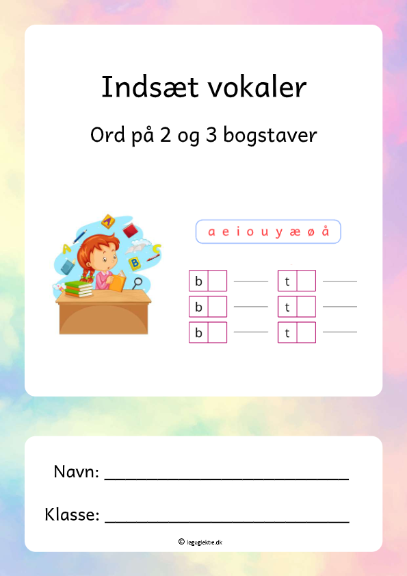 I dette hæfte kan dit barn træne at lytte efter bogstavernes lyde. Dit barn skal nemlig lytte sig frem til hvilke vokaler der kan danne rigtige ord. Nogle ord bliver noget volapyk, hvis det ikke er den rigtige vokal der sættes ind. Der er både ord på 2 og 3 bogstaver i hæftet, samt dit barn skal tegne og farvelægge et af ordene på hver side. Hæftet er farverigt, overskueligt og lige til at gå til.