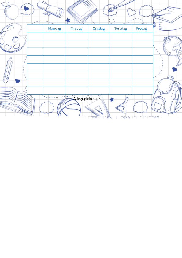 Er du pรฅ udkig efter et skoleskema, som er med til at synliggรธre skoledagen for dit barn? VI har lavet flere forskellige skoleskemaer, som du kan printe ud og hรฆnge op derhjemme. Det er bรฅde rart for barn og voksne hurtigt at kunne blive mindet om, hvornรฅr det nu lige er, der skal idrรฆtstรธj eller biblioteksbรธger med.