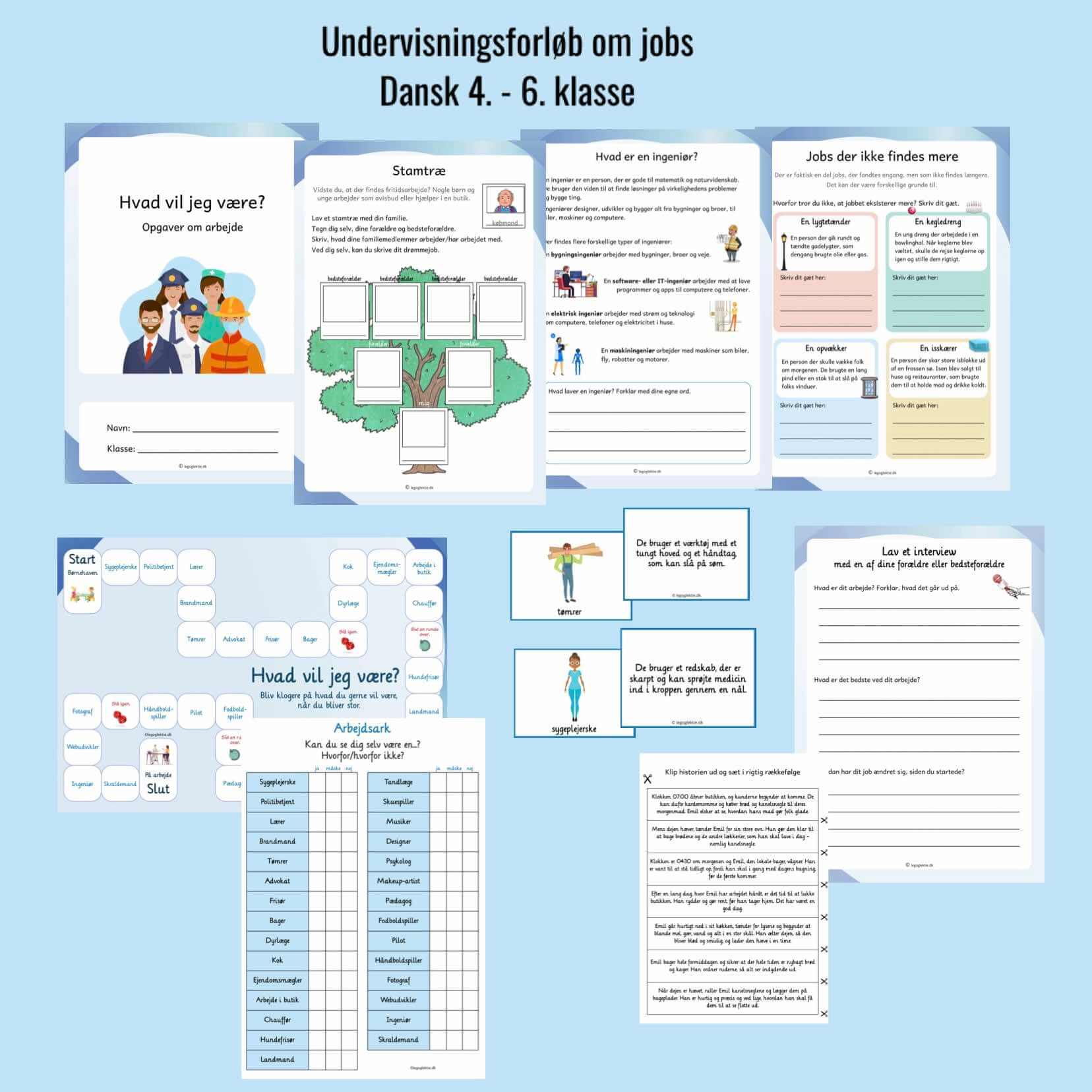 Opgavehæftet består af 16 sider, hvor dit barn i første del af hæftet vil lære om forskellige jobs. Her skal dit barn både læse beskrivelser og skrive jobbet og læse faglige læs og forstå tekster om enkelte jobs. I den sidste del af hæftet, skal dit barn selv til at reflektere over sine interesser og egenskaber. Dit barn skal også læse et jobopslag, skrive en og derefter ansøge.