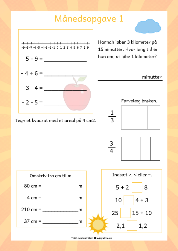 På de første to sider er der blandede små matematikopgaver med centrale emner, som dit barn skal arbejde med i løbet af 5. klasse. På de sidste to sider i hver månedsopgave er der fire regnestykker til plus, minus, gange og division. Her skal dit barn løse regnestykkerne og vise, hvordan der regnes.