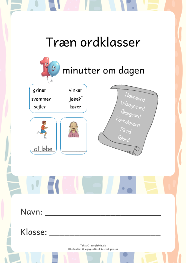 I hæftet her “Træn ordklasser i 10 minutter om dagen” kan dit barn arbejde med ordklasser som navneord, udsagnsord, tillægsord, forholdsord, talord og biord. Dit barn vil også træne uregelmæssige ord i de forskellige ordklasser Hæftet består af 40 sider, så der er rig mulighed for at få trænet de forskellige ordklasser.