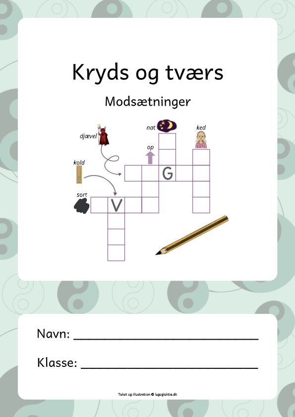 I hæftet her skal dit barn løse krydsord, ved at finde det modsatte ord til hvert billede. Ud fra billederne står der også, hvad billedet forestiller. Nederst på siden skal dit barn skrive ord-parrene fra kryds og tværsen, der er modsætninger.
