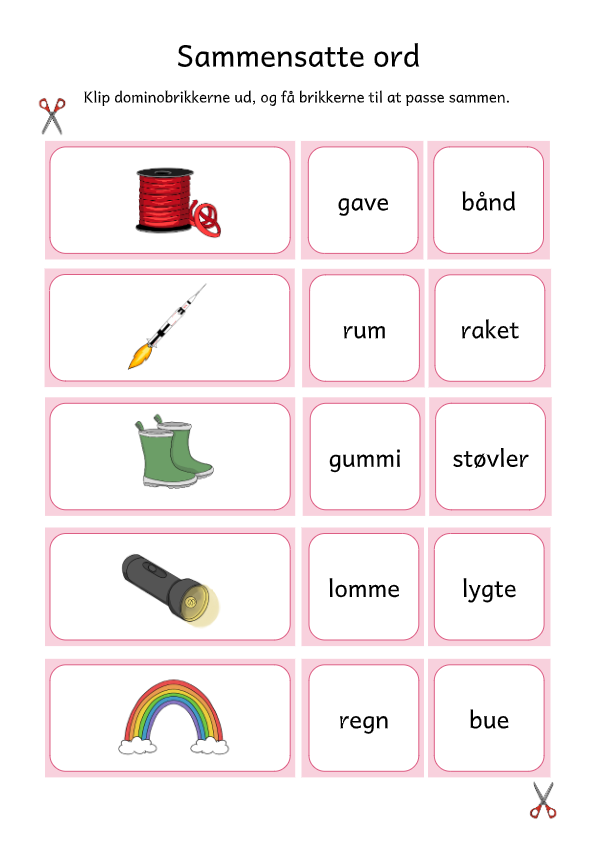 Denne aktivitet kan bruges som bรฅde vendespil, domino eller bare en sjov mรฅde at fรฅ mere kendskab til de sammensatte ord, vi bruger i hverdagen.