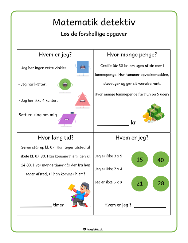 Her finder du et omfattende udvalg af skoleopgaver, der er specielt udviklet til at stรธtte dit barns lรฆring og udvikling i 4. klasse. Vores opgaver er udvalgt og lavet til at vรฆre bรฅde udfordrende og sjove, sรฅ dit barn kan trives og fรฅr visuel og sjov lรฆring.